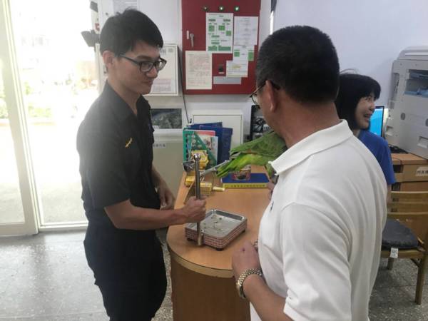 熱心的民眾是在蘆竹區長興路上拾獲這隻鸚鵡的,由於不知如何照顧,於是只好送到了派出所。員警隨後拍照透過臉書社群網站公開找尋飼主,很快的也得到了飼主的回應,並且前來派出所認領。