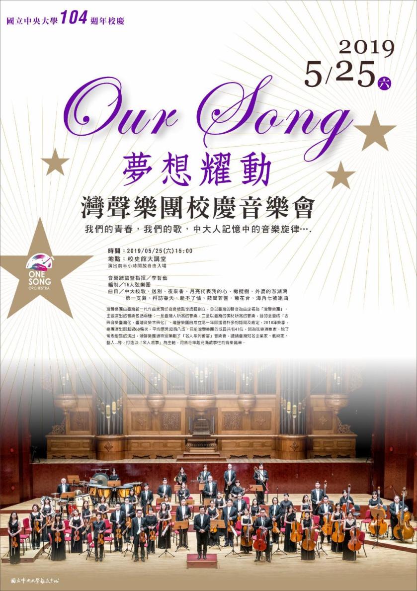 中央大學,孕育了無數的夢想與希望。5月25日(六)104週年校慶特別以「Our Song 夢想耀動」主題規劃了兩場別開生面的音樂會,分別是在戶外太極銅雕草坪的演唱會,邀請許多實力派和新生代的歌手,唱出屬於自己的歌。同時欣逢中大中文系和化材系慶祝50週年,藝文中心也邀請了灣聲樂團在大講堂演奏中大校歌和經典名曲的音樂會。活動完全免費,歡迎民眾呼朋引伴來聆聽。
