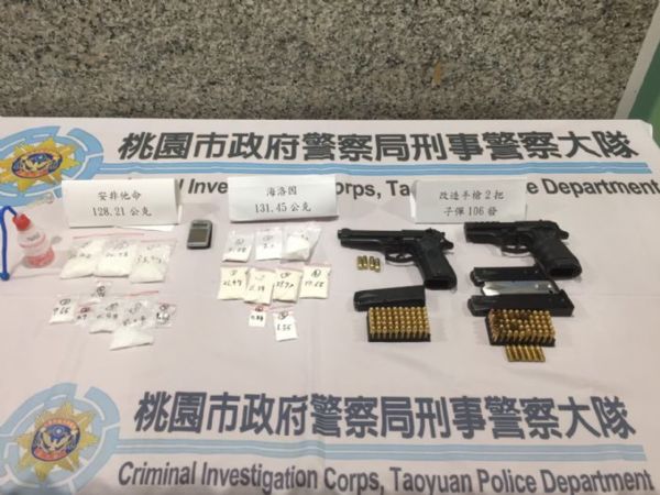 當場查獲改造手槍2支、子彈106發、海洛因131.45公克、安非他命128.21公克、電子磅秤1個及吸食器等證物,於17日訊後依現行犯移送臺灣桃園地方檢察署偵辦。