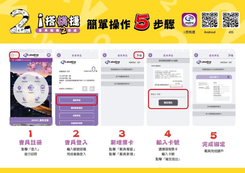 購買桃園捷運桃捷定期票好禮多多、回饋多多,趕快買起來!桃捷公司寵愛忠誠會員,會員回饋機制再升級,108年6月1日起,「i搭桃捷-會員功能」正式上線,首波感恩活饋活動-「i搭桃捷-會員點數2倍送」,凡於108年6月1日至108年8月31日,成功加入「i搭桃捷」會員,新購或續購120、135、369定期票,綁定定期票卡卡號後,皆享有消費點數2倍回饋!