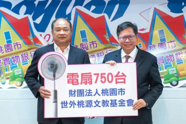 桃園市長鄭文燦30日於市府,出席「財團法人桃園市世外桃源文教公益基金會電扇捐贈儀式」,鄭市長表示,為照顧桃園弱勢民眾,市府安家實物銀行媒合財團法人桃園市世外桃源文教公益基金會,捐贈總市價約97萬5,000元的電扇共750台回饋社會,其受惠對象為桃園各家庭服務中心、原住民族家庭服務中心、新住民家庭服務中心、婦女及身障機構服務的弱勢家庭與學童等超過20個單位,未來也會持續與世外桃源文教公益基金會合作,讓愛心散播至桃園各個角落。