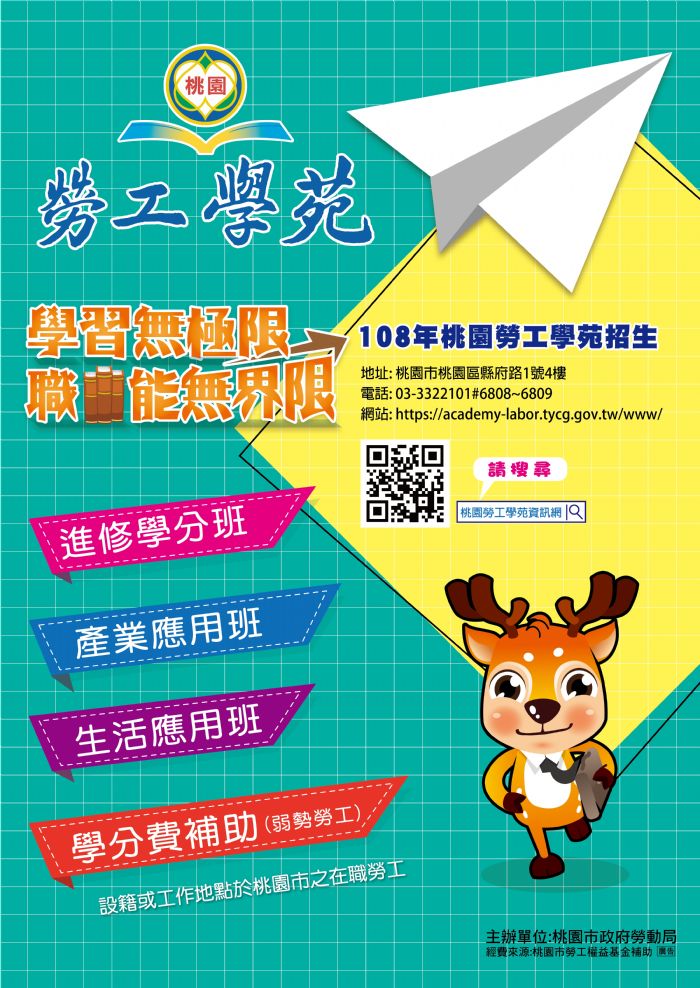 桃園市政府勞動局訂於6月4日(星期二)上午10時於桃園市綜合會議廳2樓召開「108年勞工學苑招生記者會」,當日邀請桃園市三大市級總工會理事長、民意代表、辦課單位等嘉賓與會。