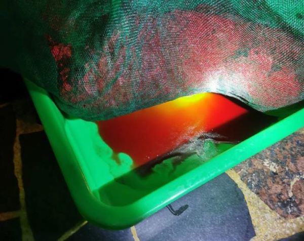 30日傍晚有民眾指出,老街溪有紅色廢水排放,環保局稽查人員獲報,立即趕往現場,到陳情地點老街溪排水涵洞勘查,現場已無紅色水質排放。環保局立刻沿紅色水痕至上游追查,於仁德路附近住家門口騎樓發現兩籃已經染成紅色的蝦米,且門口地面殘留紅色痕跡,地面積水也殘留紅色水漬。經查該住戶於30日下午以紅色食用色素將普通蝦米染紅,染完色素後泡水清洗,又將清洗後的紅色食用色素水傾倒於道路旁側溝造成水色異樣,已違反廢棄物清理法第27條規定,環保局當場依法告發。