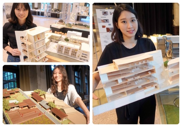 有照護失智患者經驗的陳珍順作品主題是「失智,不失所」,家住中壢的她以荒廢的建興市場大樓結合旁邊的信義國小,透過空間規劃讓失智症患者家庭互助、共享資源,希望用建築專業讓失智症照護社區化、自立化。而賴俐安則以老年生活照護為題,探討如何將都市閒置空間改造成適合日光治療、五感體驗,並且讓幼兒照護與銀髮族長照都可有效結合。老家在台南下營紅厝里的謝喬安,則為整體環境規劃出適合長者安居的健康照護示範基地。