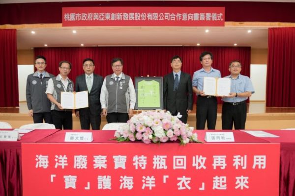 響應「世界海洋日」,桃園市政府與亞東創新發展股份有限公司簽署「海洋廢棄寶特瓶回收再利用合作意向書」(MOU),(4)日由鄭文燦市長與亞東創新發展的母公司──遠東新世紀股份有限公司副總經理張丙秋共同簽署,並邀請海洋委員會莊慶達副主委擔任見證人。自今年6月起,桃園市淨灘、淨海所清出的寶特瓶,將交由亞東創新發展公司進行清洗和破碎,再交由遠東新世紀公司抽紗,製成環保慢跑衣或其他環保產品,然後無償回饋給桃園市使用,真正落實「減塑救海洋」的美意。