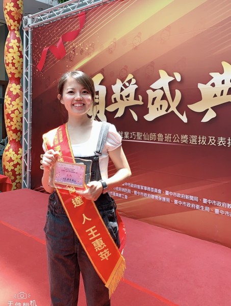 在桃竹苗分署漆作班陳協建老師的鼓勵下,一方面也希望藉由比賽與業界達人相互切磋,王惠苹報名「巧聖仙師魯班公獎職場達人及新秀選拔表揚活動」,以黑馬之姿,勇奪達人組首獎,她興奮的說,這都要感謝漆作班課程,此次比賽也運用許多「形染」的技法,就是先構圖割好模型再上色,預先掌控畫面,讓作品的穩定度提高許多,才能獲得評審青睞,贏得大獎!談起未來的規劃,王惠苹坦言漆作並不輕鬆,在戶外工作居多,還要能忍受風吹日曬,有時候早上還穿著短袖工作,到了下午寒流來了,全身又包得密不透風,衣服從夏天穿到冬天,但她仍樂此不疲,也期許自己未來利用漆作的技能賺錢養活自己,還要透過創作讓更多人認識漆作、喜歡漆作。