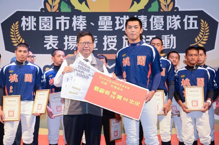 桃園市長鄭文燦14日出席「桃園市棒、壘球績優隊伍表揚暨授旗活動」時表示,桃園致力棒球運動向下扎根且普及化,除了重點學校的培育,也成功帶動其他學校的棒壘球熱潮,屢屢有優異表現。平鎮高中、新明國中、中平國小、仁善國小4所學校代表隊,已獲得國家代表權,將代表台灣參加國際級比賽,今日特別頒發244萬1,500元的獎勵金及培訓金,鼓勵本市棒、壘球優秀選手、教練、領隊及校長的辛苦,也親自授旗,期勉各代表隊在國際賽事中能全力以赴、過關斬將,勇奪佳績,展現桃園優異的棒球實力。