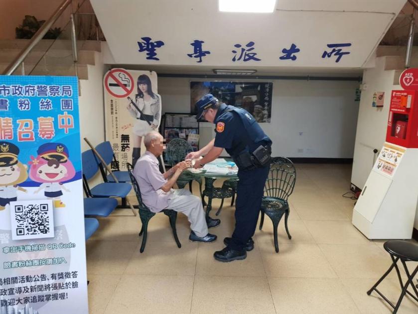 高齡92歲的老翁到派出所後,神情焦急且情緒激動的直稱「我肚子好餓想回家!」聖亭派出所巡佐傅錫城及警員劉御宣2員,看到當下場景不禁鼻酸,因在這天氣炎熱的傍晚,老翁竟獨自在外曝曬,另見老翁可能是因為體力耗盡,且有尿失禁情形沾濕了衣褲,身體不停地顫抖,隨即自掏腰包購買晚餐及熱飲給老翁果腹,關懷照料安撫情緒後,經警用電腦人臉辨識系統比對後,才確認高齡老翁身分,因而順利的找到家屬,將老翁平安帶返家。