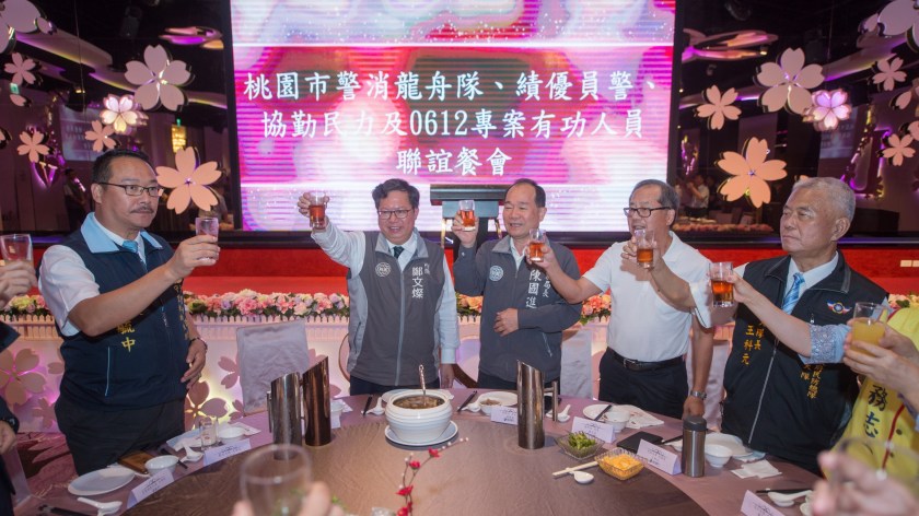 桃園市長鄭文燦24日前往桃園區,出席桃園市108年警消龍舟隊、績優員警、協勤民力及0612專案有功人員聯誼餐會,表揚相關有功警消人員。鄭市長表示,桃園市相當支持警消人員,這兩年將增補約926名警力、500名消防人員,減輕警消值勤壓力,也非常感謝桃園超過1萬5,000名協勤民力無私付出,做員警最佳後盾。為慰勉警察辛勞,他也特別選在警察節後,表揚警界14類、140位楷模,包含績優員警楷模69位及協勤楷模71位,表達對警察團隊的感謝及最高敬意。