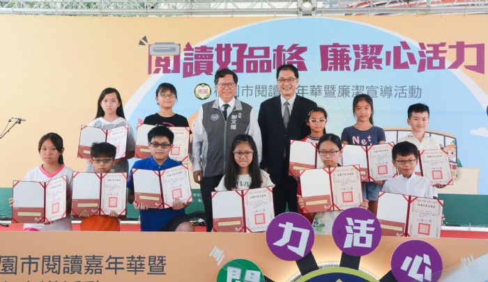 桃園市長鄭文燦25日上午前往龜山區文華國小,出席「閱讀好品格•廉潔心活力―桃園市閱讀嘉年華暨廉潔宣導活動」。鄭市長表示,市府與法務部廉政署合作辦理「廉潔教育校園宣導專車系列活動」桃園場活動,推出書法展、趣味競賽等項目,推廣閱讀與廉潔教育。品格是一輩子的資產,市府將持續推動品格教育從小扎根,讓孩子養成廉潔的信念,與他人建立起更誠信的友誼。