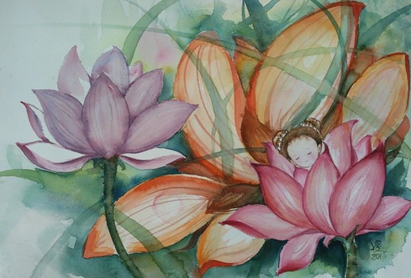 「桃園市觀音區是我的故鄉。總覺得自己個性靦腆木訥,但內心卻有著率真調皮的另一面,也許這內心的層面,是顯現在畫中最真實的那一面。」,本期在楊梅區戶政事務所展出的許宜璟女士說。