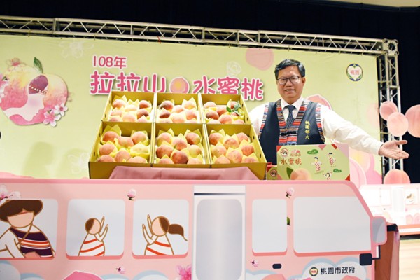 桃園市長鄭文燦3日上午前往桃園市綜合會議廳,出席農業局「108年拉拉山水蜜桃行銷記者會」。鄭市長說,桃園的拉拉山水蜜桃非常受到台灣市場的歡迎,市府也很重視水蜜桃的產銷。除了每年6月至8月的盛產期,針對5月出產的水蜜桃,市府也推出「媽媽桃」的水蜜桃品牌,協助果農行銷在地水果。這次的水蜜桃行銷活動,市府希望能結合北橫的觀光,邀請市民朋友到復興區品嚐正宗的拉拉山水蜜桃,也一起體驗復興區的部落風情。