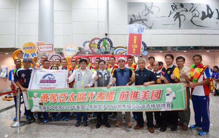 桃園市長鄭文燦5日下午前往桃園國際機場,歡迎平鎮高中參加2019年美國小馬聯盟帕馬級亞太區青棒錦標賽團隊載譽歸國。鄭市長說,平鎮高中青棒代表隊6月30日赴日本宮崎參加「2019年美國小馬聯盟帕馬級亞太區青棒錦標賽」,以4比1擊敗地主日本隊,再以6比2擊敗韓國隊,兩戰全勝的戰績傲視本屆亞太區賽事,勇奪亞太區青棒錦標賽冠軍,取得亞太區代表權。市長恭喜平鎮高中的選手與教練,也期勉中華小將8月前往美國德州參加世界賽,戰無不勝,邁向世界冠軍榮耀。