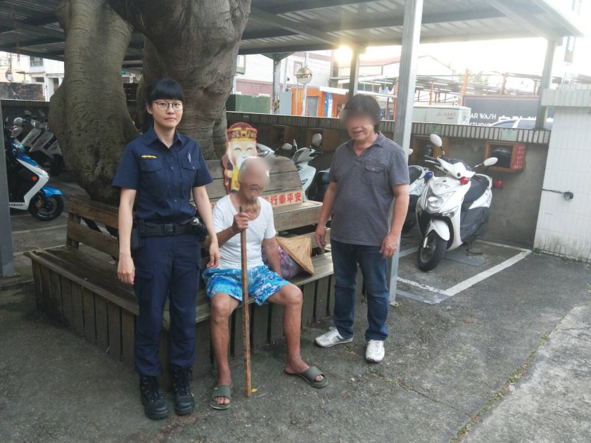 新北市林口區9旬老翁罹患失智症昨日上午外出走失,家屬四處找人,下午出現在桃園市龜山區大湖路,民眾發現老翁走失報警處理,坪頂派出所警員陳盈君、藍金富到場處理,因老翁身無證件年邁、鄉音重說話沒人聽懂,員警駕車載著老翁沿路詢問民眾有無認識該老翁,車輛經過大湖ㄧ路突然壓過一根棍子以為爆胎,員警下車查看拿起棍子反而老翁異常激動,發現桿子「見到這位老人請連絡家人」才知道是老翁所有,依循電話通知家屬趕到派出所認領,家屬表示父親常走失又不願配掛防走失手鍊,才在拐杖上書寫電話也讓員警順利聯繫上。