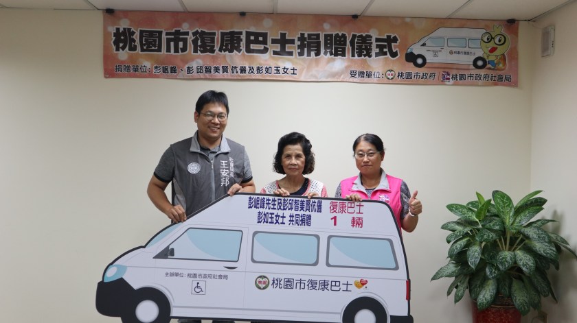 社運急先鋒彭如玉及父母聯名,8日捐贈桃園市政府社會局1輛高頂復康巴士,母親彭邱智美女士代表出席捐贈,由桃園市政府社會局王安邦局長受贈。