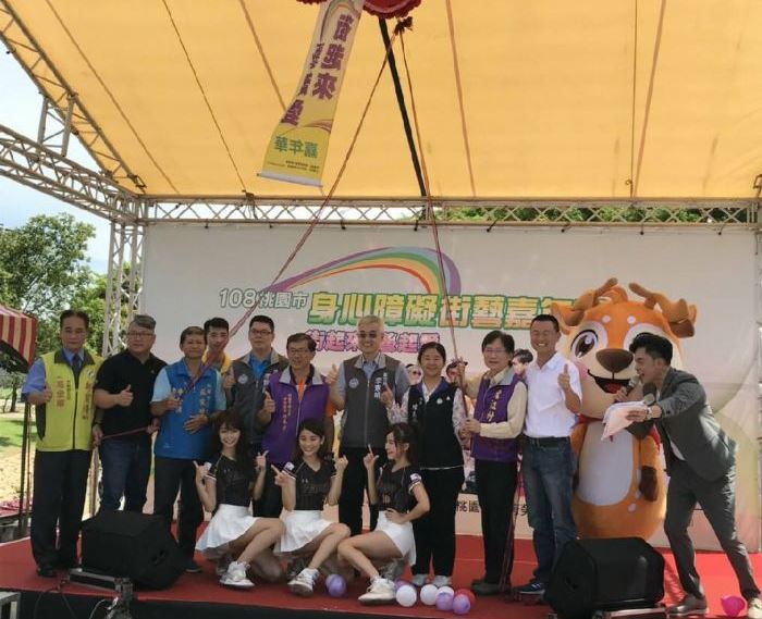 桃園市副市長憲明13日上午前往風禾公園出席【2019桃園身障街藝嘉年華】,李副市長表示,桃園市致力推動身障街頭藝人考照及展演,並結合地景藝術節等活動,讓身障朋友們的特殊才藝能在各場域展現,也能在就業舞台上發光發熱。接著李副市長與勞動局李賢祥副局長及多位貴賓及勞動局吉祥物有頭鹿一起啟動嘉年華,共同呼籲企業機關構未來能提供身障藝人更多商業演出機會!