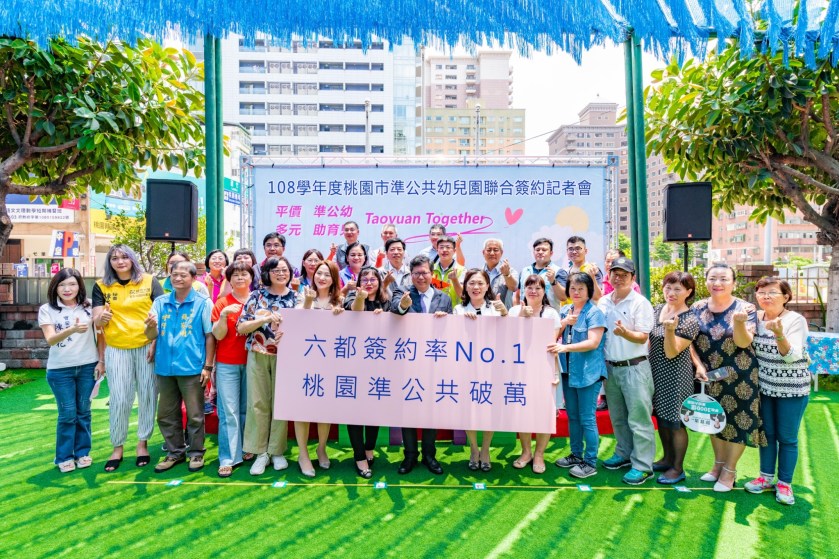 桃園市長鄭文燦19日上午前往私立柏克來幼兒園,出席「108學年度桃園市準公共幼兒園聯合簽約記者會」,鄭市長表示,政府積極推動準公共托育政策,鼓勵私立幼兒園與政府攜手,提供家長們平價優質的托育環境;桃園目前約有188家私幼符合準公共申請條件,截至目前,共91間完成簽約,加入準公共的行列,共計提供1萬278個教保名額,簽約率達48.4%,居六都之冠,代表桃園在完善托育環境上往前邁進一大步,同時也提供家長更多新的托育選擇。