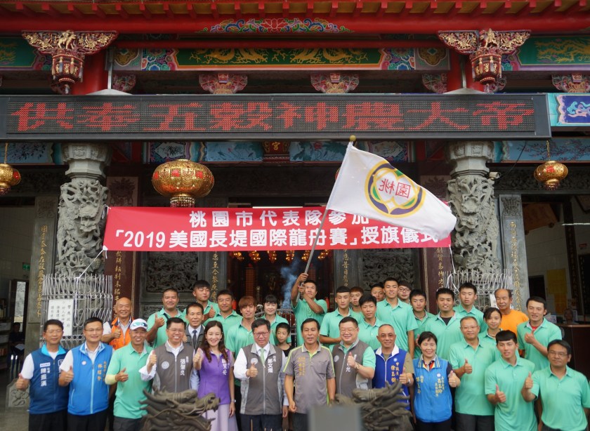 桃園市政府客家事務局於20日假龍潭龍元宮舉辦桃園市代表團參加「2019美國長堤國際龍舟賽」行前授旗儀式,市長鄭文燦、客家局長何明光、秘書處長顏子傑、馬來西亞友誼及貿易中心代表何瑞萍等貴賓一同出席為TAIWAN TAOYUAN隊的選手加油,來自桃園姊妹市的馬來西亞濱洲舞獅工委團帶來精彩開場表演,並由市長鄭文燦授旗予客家局長何明光及龍潭區長胡星輝,預祝即將於7月24日出發的代表團首度參賽旗開得勝。