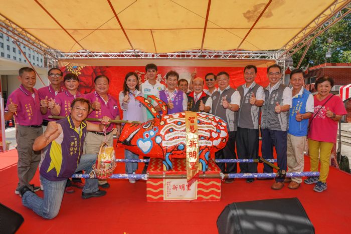 桃園市政府客家事務局委託中壢區公所及平鎮區公所承辦之「2019桃園客家義民祭」活動記者會(6)日於平鎮褒忠祠登場,由副市長游建華、客家局長何明光、中壢區長吳宏國、平鎮區長鄭詩鈿及貴賓共同幫金神豬披金腰帶,抬起金神豬,預祝今年活動順利也為義民祭活動揭開序幕。