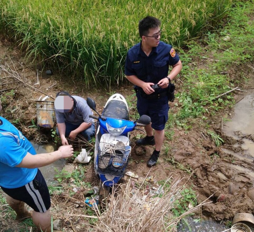 真是千鈞一髮!桃園平鎮區一對林姓父子趁強颱利奇馬襲臺停雨空檔,搶時間外出巡田,沒想到一陣強風將父子二人連同機車,吹落到坡坎旁的稻田中,機車被爛泥卡住,父子倆費盡氣力也無法將機車推出田外,還好平鎮派出所巡邏警員陳瀅亘、顏啟峻行經該地,二警踩著爛泥協助將機車推出,也讓林姓父子頻頻感謝警方幫忙。