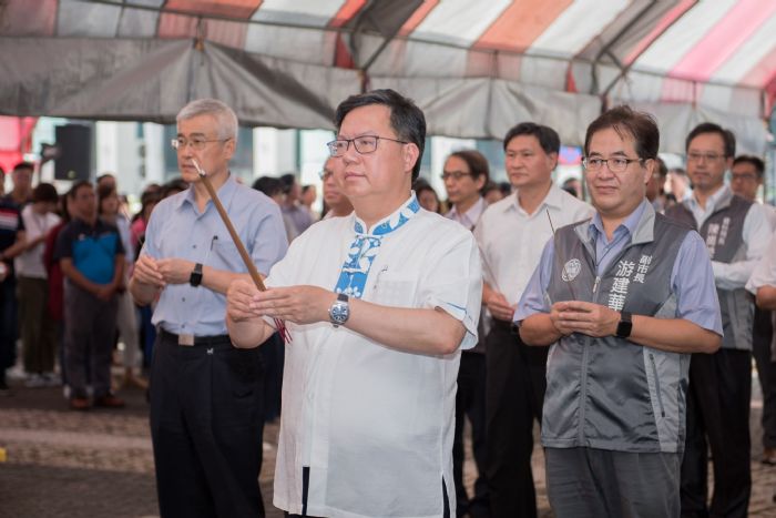 桃園市長鄭文燦15日下午於市府前廣場,率市府團隊出席「桃園市政府108年度中元節普渡祭祀典禮」,鄭市長表示,中元普渡是結合眾生平等觀念的台灣傳統習俗,藉此表達對於無主孤魂的敬畏。鄭市長祈求桃園建設持續進步、市民闔家平安,也期勉市府同仁繼續面對未來的挑戰。