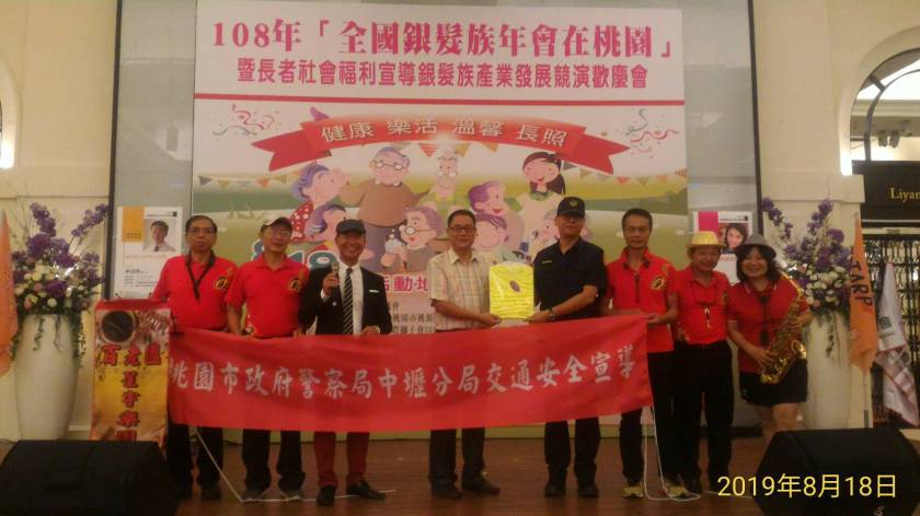 中壢分局結合「桃園市桃源銀髮族協會」舉辦全國年會之際,辦理銀髮族交通安全宣導。
