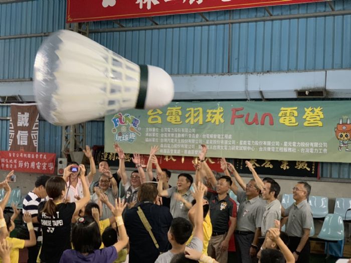 台電公司於(20)日上午在台電輸變電工程處處長黃清松率領下,於龜山區勝光羽球場舉辦為期5天的「台電2019羽球FUN電營」活動,由台電羽球球星帶領小球員們體驗羽球運動趣。