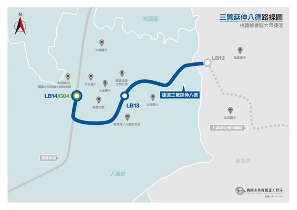 捷運三鶯線延伸八德段連結桃園「三心六線」捷運路網和新北「三環六線」捷運路網,未來LB14站與桃園捷運綠線G04站採「地下雙鐵共構」,捷運工程局陳文德局長表示:捷運三鶯線的LB14站與捷運綠線G04站未來會在地下轉乘,捷運綠線在上、三鶯線延伸八德段在下,串連台北、板橋、新北和桃園地區,未來八德區會是桃園往返新北及台北重要的轉乘點之一,透過站內轉乘,30分鐘就能快速的從八德經三峽鶯歌到土城,縮短桃園到台北的通勤時間。
