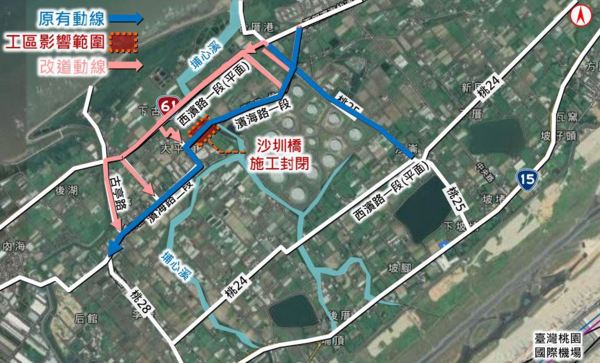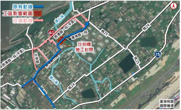 桃園市「大園區沙圳橋橋梁改建工程」自108年9月5日上午9時至109年5月16日下午6時進行施工作業,工區全日圍設,施工期間沙圳橋封閉,施工期間請用路人配合改道通行,行經該路段時注意道路線形變化,並遵照改道後之標誌、標線指示減速慢行。