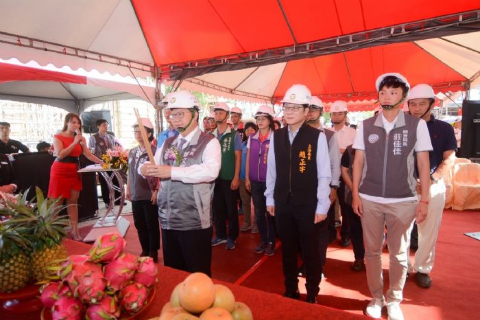 桃園市長鄭文燦29日下午前往八德區主持「北景雲計畫統包工程上梁典禮」,鄭市長表示,八德區人口已突破20萬人,且持續快速成長中,市府投入超過12億2,000萬元,於大湳精華地段興建複合式公共設施,將一口氣設置7大設施:八德國民運動中心、大湳消防分隊、市民活動中心、公托中心、日照中心、圖書館、地下停車場,工程自去(107)年9月開工,預計明(109)年10月23日竣工,今日舉行上梁典禮,祈求工程如期如質完成,進一步提升八德地區生活品質。