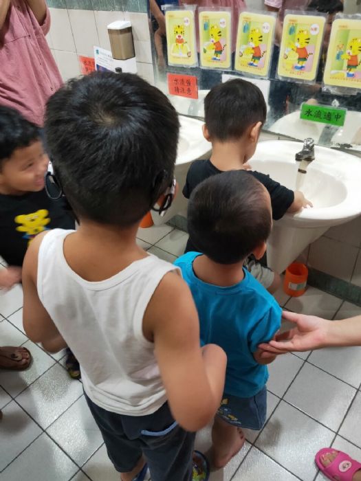 桃園療養院小太陽學園運用多感官性的教學模式,將正確洗手時機及步驟融入教學內容中,增加腸病毒預防宣導活動及衛教海報張貼,時時提醒正確洗手的重要性,落實入園前測量體溫、正確洗手,做好感控風險管理,讓早療個案能開心洗手,安心上課,「跟細菌說bye-bye」-有效杜絕腸病毒發生。