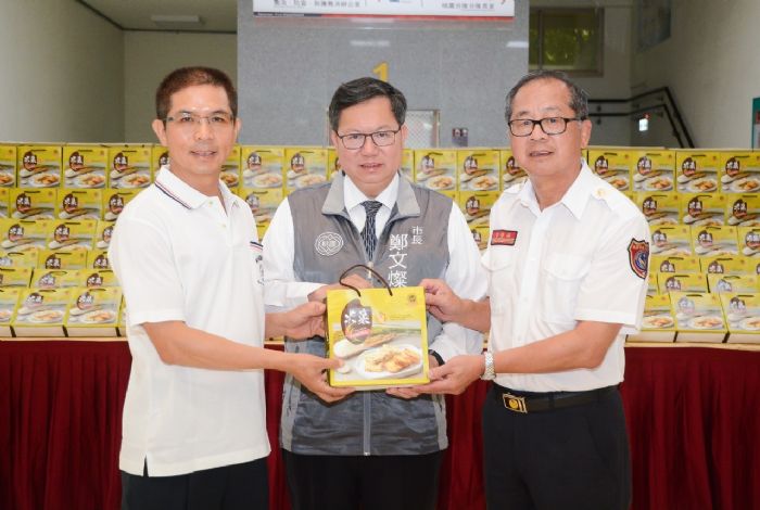 桃園市長鄭文燦(5)日上午於市府消防局大廳,出席「108年郭祿食品有限公司暨日森開發有限公司聯合中秋節慰勞消防同仁」儀式,鄭市長表示,每逢中秋佳節,郭祿食品、日森開發皆會特別捐贈物資給打火弟兄,今年選用桃園米製作米果禮盒,非常可口,相信對於打火弟兄們來說是很溫暖的鼓勵;中秋節前夕,鄭市長也向所有堅守崗位的國軍弟兄、警消同仁、醫護人員致意,感謝他們的付出與努力,讓社會更加祥和安全。