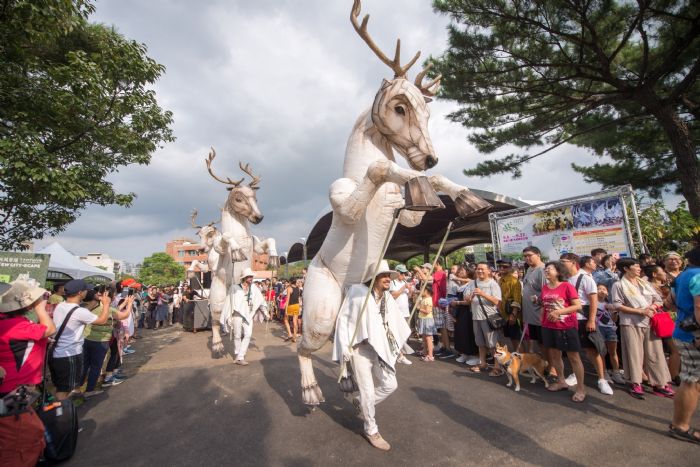 桃園市長鄭文燦7日下午前往在八德區大湳森林公園舉辦的桃園地景藝術節,欣賞法國Remue-Ménage馬戲團《麋鹿森林》等表演活動。鄭市長表示,2019桃園地景藝術節總計展出34組作品,包括繪畫、雕塑、建築、設計等藝術創作,活動期間也以大地舞台、森林舞台、水廣場等為演出據點,邀集3團國外著名表演團隊,以及16團國內優質表演團隊,展現新馬戲、音樂、舞蹈及戲劇等豐富表演,歡迎大家攜伴或親子共遊,到地景藝術節看表演、品藝術。