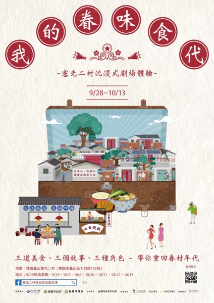 桃園市政府文化局於9月29日(星期日)至10月13日(星期日)期間假日於龜山憲光二村舉辦,以眷村故事結合食物設計的沉浸式劇場演出,於9月13日開放活動報名,不管是愛眷村、愛美食還是愛表演的你都不容錯過!