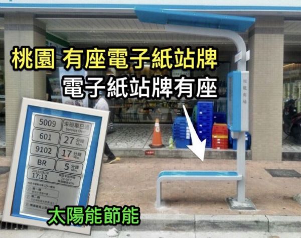 為提升桃園市公共運輸候車環境,除建置候車亭及智慧型站牌外,桃園市政府以智慧、節能的規劃概念發想,並延續既有集中式站牌的風格,結合最新科技的電子紙、太陽能及候車座椅等元素,推出全國首創的座椅式「智慧節能電子紙站牌」,站牌除考量老弱婦孺的座位需求,於站牌設計上增加貼心座椅外,並提供候車民眾公車即時動態資訊。