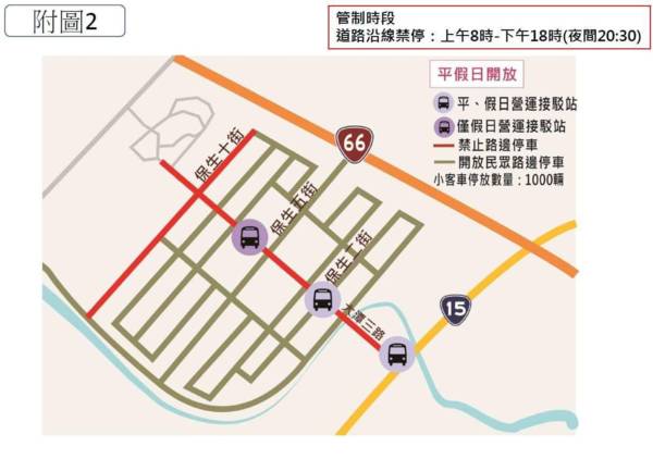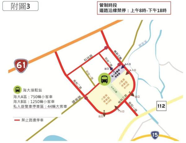 乙、大潭停車場周邊:觀音區大潭三路、保生十街延長管制時間至20時30分。