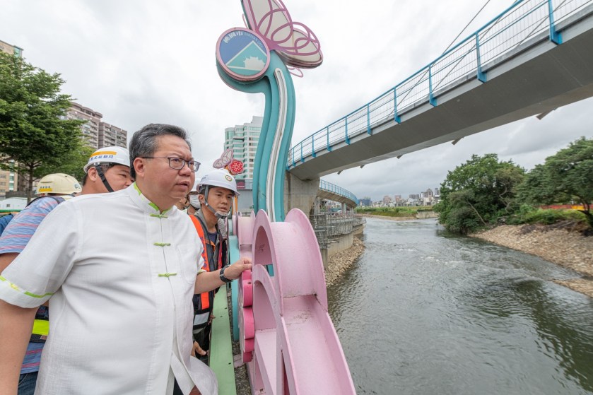 鄭市長隨後視察南崁溪「經國二號橋上游至大檜溪橋下游護岸整建暨水域營造」工程,鄭市長表示,桃園升格後已陸續新建5座橋梁,其中印象大橋包括上下游坡道總長609公尺,本工程於107年1月開工,工程經費新臺幣1億8,600萬元,工程進度95%,完工後對於提升河岸防災能力及景觀美化具有極大助益,並成為南崁溪斷點整合計畫的新里程碑。目前已進入工程尾聲,因施工過程所設的臨時便道及臨時塔柱可能阻礙通水,水務局預先拆除臨時設施,以通暢南崁溪排洪斷面。