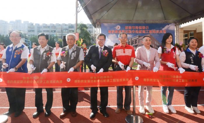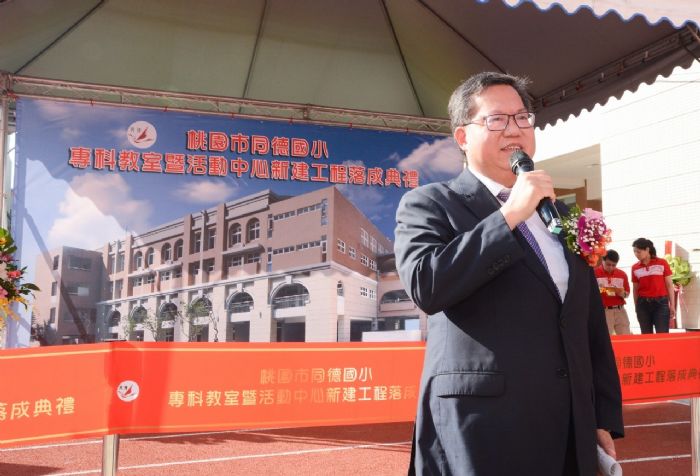 桃園市長鄭文燦(5)日上午出席「同德國民小學專科教室暨活動中心新建工程落成典禮」時表示,同德國小學區位於藝文特區,發展迅速,自民國88年創校迄今,已由原設校規模48班擴增至58班,然而同德國小校地面積僅1.9公頃,建物活動空間明顯不足。為有效改善校舍空間,同時考量師生教學需求,多元發展藝文特色課程,市府歷經3年規劃,自民國106年起補助新建多功能專科教室暨活動中心,本工程落成啟用將有效解決教室空間不足的問題,讓師生有更好的互動環境,也能提供鄰里居民共享市政資源。
