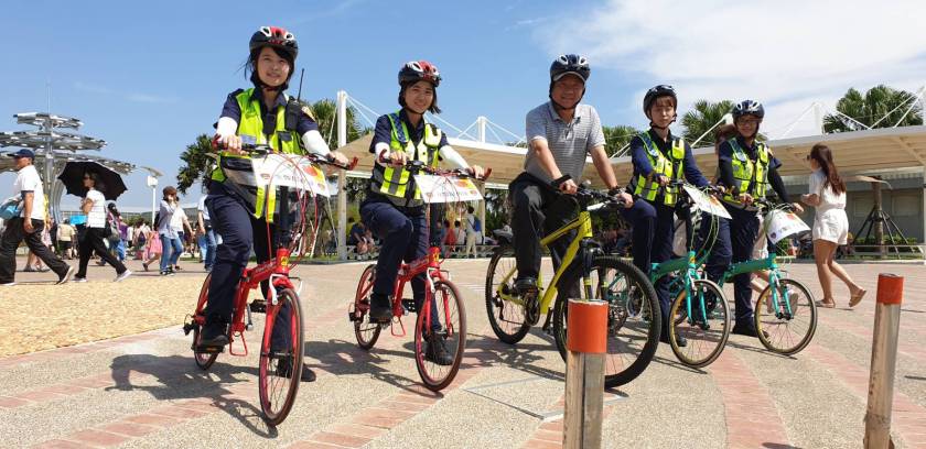 桃園市政府警察局楊梅分局執行「2019桃園農業博覽會」勤務,為能機動服務會場行人徒歩區(該區域嚴禁動力車輛進入)賞農博遊客,並避免干擾遊客賞花卉興致及能迅速處理突發事件,特別購置6部腳踏車供員警巡邏使用及服務民眾。