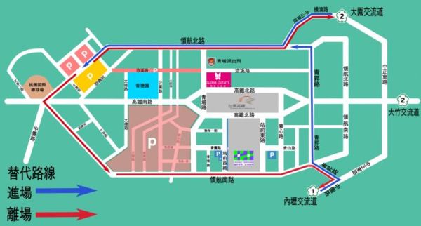 二、內壢交流道接中園路、青昇路、領航北路至停車場。