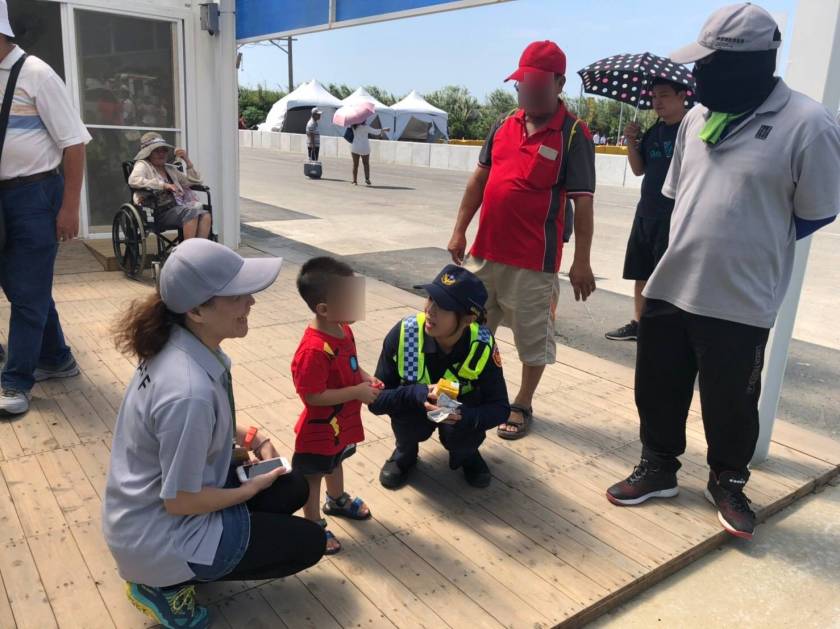 桃園農業博覽會內容精彩,雙十連假吸引大批民眾前來朝聖,一名簡姓民眾趁連假的最後一天帶著寶貝孫子前來體驗農博魅力,但因展出的農產太吸睛,孫子又被一旁的大型動物造景吸引不慎走失在園區內,所幸楊梅分局女警簡睿雅、許喬琦發現後安撫幼童並緊急聯繫到幼童家屬,其家屬感謝員警貼心服務,大讚真是人民保母。