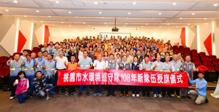 桃園市長鄭文燦17日上午前往桃園市綜合會議廳,出席「108年新水環境巡守隊授旗儀式」。鄭市長說,桃園有許多天然的水環境,包括海岸、河流及埤塘等,其中約有6成需仰賴水環境巡守隊協助。市府環保局自於105年起進行公開招募,截至107年底已有57支水環境巡守隊。今(108)年6月再招募9支生力軍,總隊伍數達66隊,隊員數2,483人,無論是隊伍數或是志工人數皆為全國之冠,今日特地為新加入的水環境巡守隊舉行授旗儀式,歡迎新隊伍加入守護桃園水環境的行列。