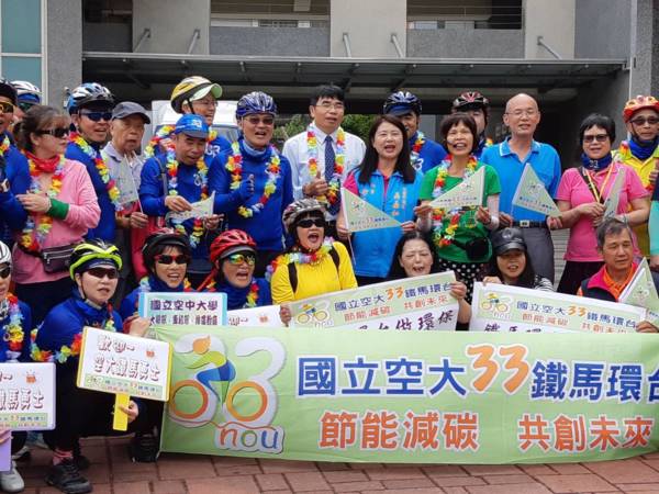 國立空中大學為慶祝創校33週年校慶,提倡鐵馬環保行,由校長陳松柏博士率領蘆洲校本部教職員代表10多人,進行10天鐵騎環島行。昨日中午12:10,首站抵達桃園指導中心【中壢家商】校門口,受到壢家校長莊祿崇,市議員吳嘉和夫人,桃園校友會理事長謝璦璘等校友代表獻花致意,表達熱烈歡迎。