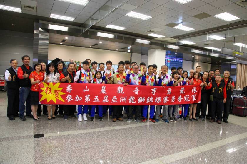 由中國大陸重慶市銅梁區承辦的「第五屆亞洲龍獅錦標賽」,代表中華隊參賽的桃園市龜山區壽山巖觀音寺舞龍獅隊,報名參賽的三個競賽項目都獲獎,除了贏得金、銀、銅牌各一面之外,並榮獲舞龍項目總成績第一名,為國爭光的英雄們11月1日晚間載譽返國,於松山機場受到壽山巖觀音寺信眾和董監事熱情迎接。