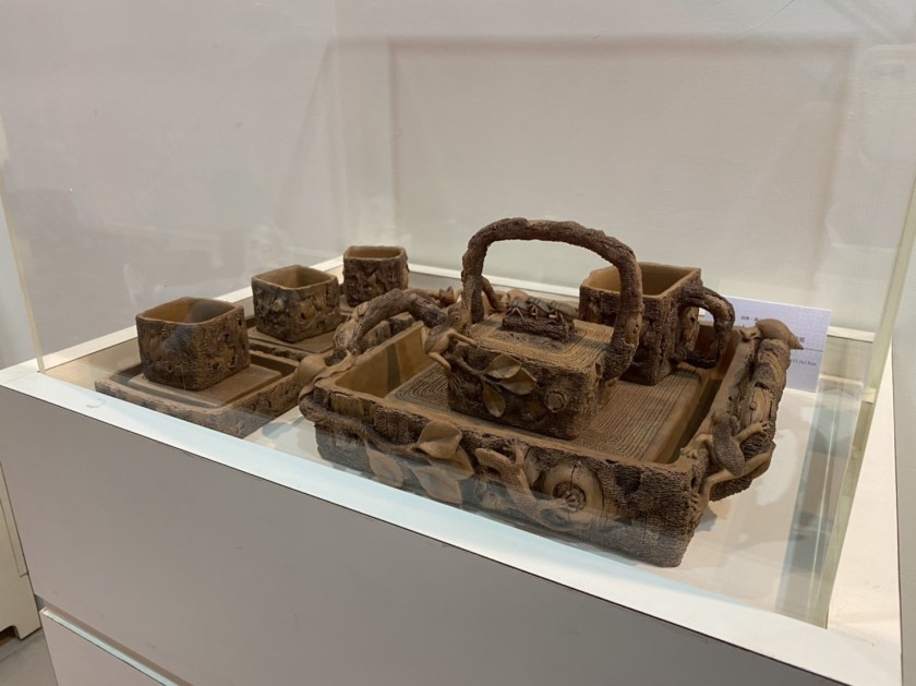 此次開展的葉劉金雄老師,歷經五十年的努力、自我挑戰不輟,以其陶土藝術的獨特風格,成就陶雕寫意的新境界。葉劉老師出生於桃園新屋,先後師從於李澤藩與李梅樹大師,客家庄質樸自然的環境氛圍對其創作影響甚深。他擅長將陶壺雕塑成樹段、朽木及竹節的形貌,捏塑精細而傳神,造型均衡而協調,壺體點綴以蝸牛、蜥蜴及樹蛙等元素,具層次變化亦收畫龍點睛之效,農村景致渾然天成地融入其作品,不但充滿活力與生機,更展現至情至性的美學藝境。