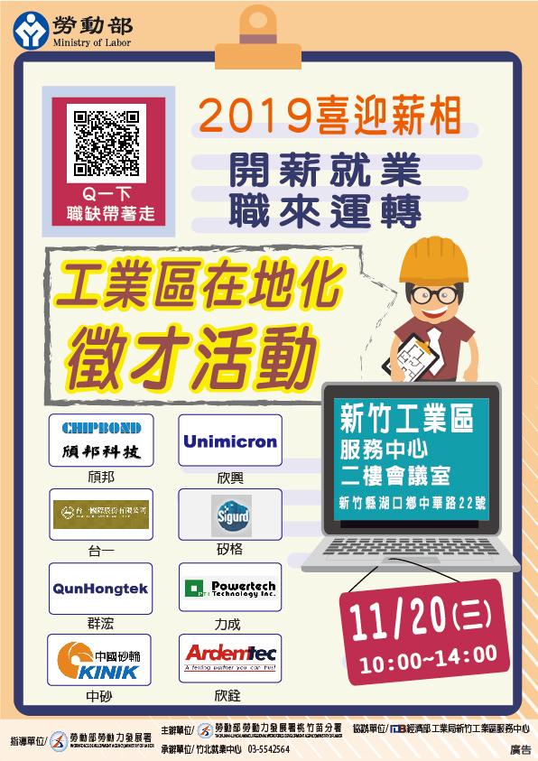 竹北就業中心表示,20日(三)徵才活動共邀請17家在地知名廠商參加,其中不乏千人大廠,提供熱門工作機會1,131個,本場次也將是今年新竹縣的最後一場較具規模的徵才活動,20日徵才以新豐、湖口在地知名製造業廠商為主,其中多達半數的廠商廠商具千人規模,例如力成科技、欣興電子及頎邦科技等廠商,其中頎邦科技更是祭出最高月薪70K尋找工程師,班制津貼還可另計;本場徵才活動不僅有超高薪職位釋出,還有不少廠商開出上百職缺,力成科技更開出266個工作機會,準備在年底前一舉網羅優質人才,竭誠歡迎求職及轉職朋友踴躍參加