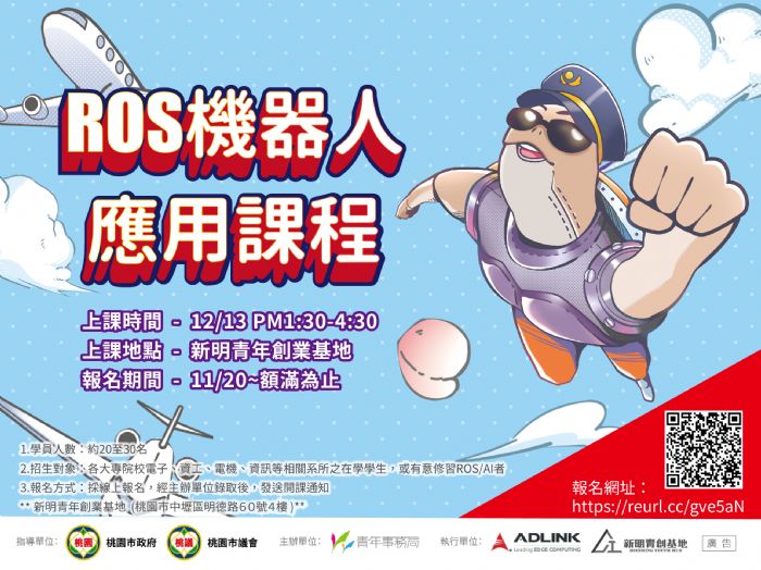 桃園市政府青年事務局將於今年12月13日於桃園新明青創基地,辦理「ROS機器人應用課程」,將於11月20日起開放報名,本次課程青年局更準備10台機器人原型套件,讓有志深入機器人領域的你,習得產業最新趨勢與實務;課程完全免費,名額有限,快來報名!