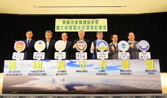 為加強查緝環保犯罪,護守桃園海岸環境生態,桃圍市政府與桃園地檢署於11月22日共同舉行檢警海環擴大結盟記者會,由桃園市副市長李憲明與桃園地方檢察署代理檢察長郭文東共同發起,行政院環保署副署長沈志修、內政部警政署保安警察第七總隊長張春波、海洋委員會海巡署北部分署長黃民芳、警察局長陳國進、環保局長呂理德共同宣示打擊環保犯罪的決心!透過結盟互助的方式,能夠更迅速的打擊環保犯罪,伸張環境正義,瓦解跨區犯罪集團,有效遏止不肖業者污染行為,共建美麗桃花源。