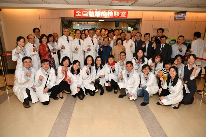 ◎桃園長庚「全自動智能檢驗室」今日啟用,(左6為楊政達院長)