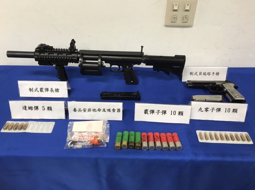 警方在現場清查鄭男隨身物品時,驚見鄭男包包中竟有制式貝瑞塔手槍及制式霰彈長槍各1把,90子彈及霰彈各10顆、安非他命及吸食器等,其中還發現殺傷力極強的達姆彈5顆,且子彈已上膛,還好鄭男並無持槍抵抗,否則後果不堪設想。